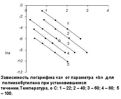 Для иллюстрации на рисунках 1 и 2 приведены экспериментальные зависимости вязкости каучука η от некоторого параметра «b» и линейная зависимость между «b» и некоторой функцией «а». Данная зависимость позволяет путем линейной экстраполяции прогнозировать вязкость полимерных расплавов от характеристик сдвигового течения - напряжения и скорости сдвига.