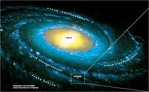 Глобальным «домом» для Земли является галактика Млечный Путь. Почти все звёзды нашей Галактики находятся практически в одной плоскости. Из центра галактики, где, предположительно, находится чёрная дыра, раскручиваются звёздные скопления в виде рукавов. В рукаве Ориона находится наша Солнечная Система. Вся наша Галактика, как фантастический космический корабль летит по Вселенной со скоростью 600 км/сек. В свою очередь наша Солнечная Система, увлекаемая Солнцем, движется со скоростью 400 км/сек. Ядро Галактики условно находится между созвездиями «Стрельца» и «Скорпиона». Зная направление и скорость Галактики, можно указать условную точку, откуда мы прилетели. Направление на эту точку находится сегодня в созвездии «Пегаса».072;».