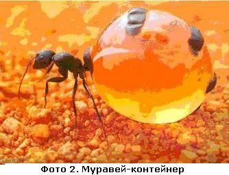 На Фото 2 изображён муравей-контейнер, создающий запас нектара на зиму. Когда муравьиная семья выростает до 200000 – 300000 особей может наступить процесс её деления. Семья может разделиться на 2, 3 и болле колонн. Иногда муравьиная семья насчитывает до 12 колонн. Но живут все муравьи в одном муравейнике и общая численность может достигать до 2 млн. особей.